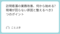 記録や申し送りを整えるとき、いきなり全体の書き方を決める必要はありません。まずは「ここだけは共通にしよう」というポイントを3つだけ決めるので十分です。